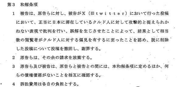 1 被告は、原告らに対し、被告がX(旧twitter)において行った投稿において、正当に日本に滞在しているクルド人に対して攻撃的と捉えられかねない表現で批判を行い、誤解を生じさせたことによって、結果として相当数の閲覧者がクルド人に対する偏見を有するに至ったことを認め、既に削除した投稿について投稿を撤回し、謝罪する。